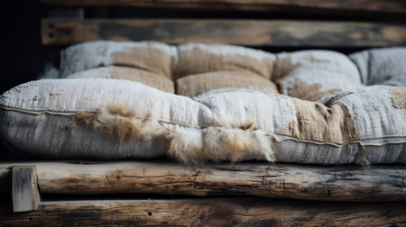 a wooden bench adorned with pillows showcases raw vulnerability and attention to texture, featuring fur and feathers. the unprimed canvas exudes farm security administration aesthetics, while selective focus highlights the use of fabric. captured with a fujifilm x-t4, this image captures a unique blend of rustic charm and artistic composition. ai generated