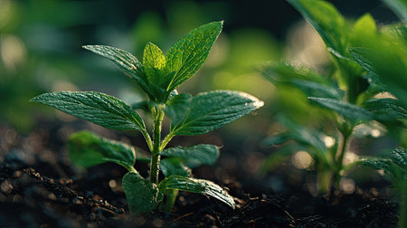 Small fresh leaves, growing upright in fertile soil, sunlight filtering gently, realistic textures, vibrant green tones, natural photography style, wide balanced composition for timelapse video.