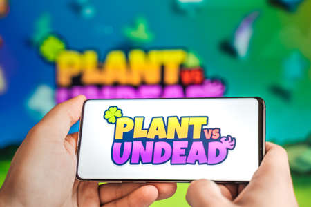 Russia Moscow 04.09.2021.Logo,screenshot of Plant vs Undead, PVU token.Blockchain nft ethereum cryptocurrency game in laptop,mobile phone.Man playing with crypto coins.Earning digital money.Land,hero.