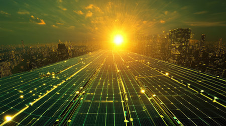 A vibrant 3D illustration of glowing solar panels under radiant sunlight, capturing the essence of urban sustainability and modern energy solutions in a digital landscape.
