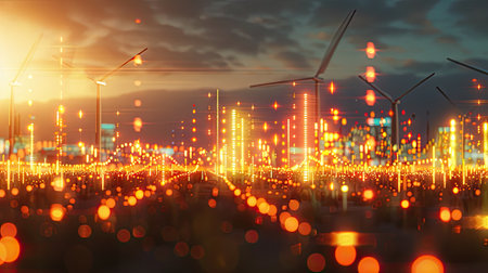Technology and sustainability merge at sunset over a wind farm with digital data overlays. Generative AI