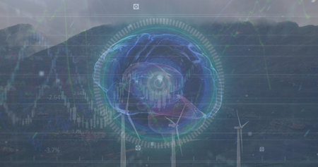Image of interface with data processing against spinning windmills on grasslands. Renewable energy and business interface technology concept