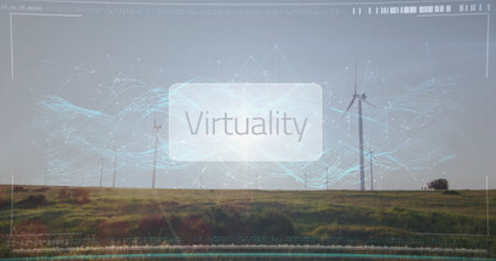 Displaying network overlay floating over wind turbines on grassy wind farm, with Virtuality HUD. Futuristic, sustainable, renewable, tech, innovation, environmental, digital