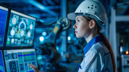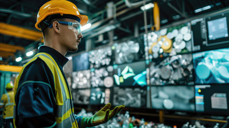 Focused worker in safety gear and helmet analyzing data on multiple screens in industrial setting. Concepts of industrial technology, safety standards, and data analysis.