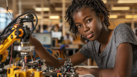 Young girl with curly hair is focused on assembling robotic project in modern classroom filled with technology. Her expression shows determination and curiosity as she engages with equipment