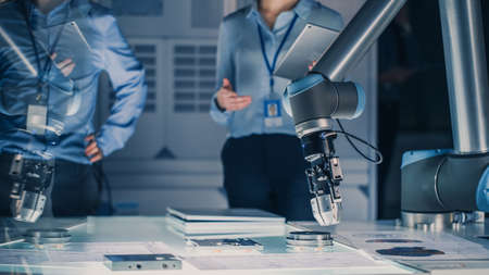 Futuristic Artificial Intelligence Robotic Arm Operates and Moves a Metal Object, Picks It Up or Puts it Down under Technician Control. High Tech Research Laboratory with Modern Equipment.