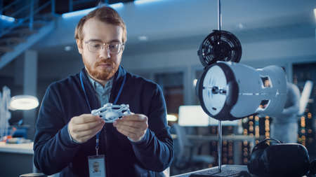 Electronics Development Engineer Working at His Desk, Fits New Technological Component into Prototype. Professionals Work in the Advanced Technology Designing Agency. Modern Research Centre