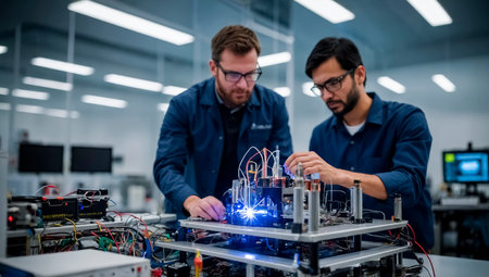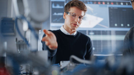 Two engineers work together on a complex technology project in a high-tech laboratory.