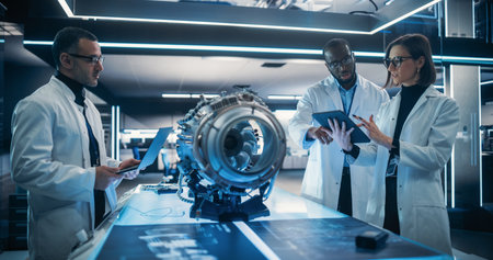 Young Team of Multicultural Engineers Use Blueprints, Tablet and Laptop Computers, Analyze and Discuss How a Modern Electric Turbine Motor Works. High Tech Research Laboratory