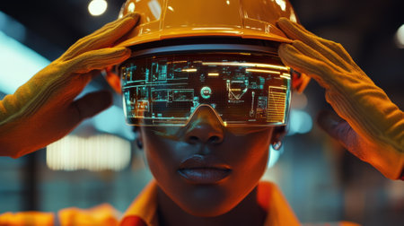 Zoomed in on a worker adjusting their safety helmet the AR visor projecting caution symbols and alerts regarding overhead lifting equipment and safety protocols in vivid colors