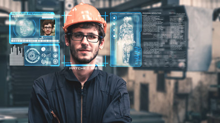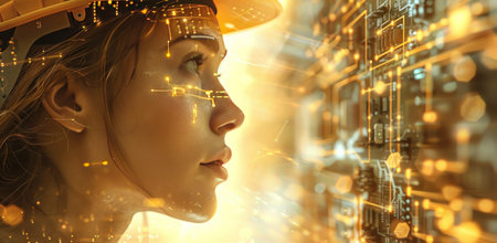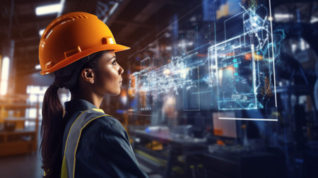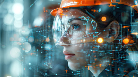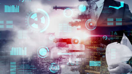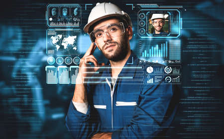 Double exposure image of an engineer and a digital hologram, illustrating the connection between industrial expertise and cutting-edge technology with this inviting photo.