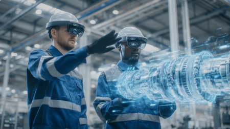 industrial apprentices interacting with virtual models of turbines and engines using AR gear. Generative AI