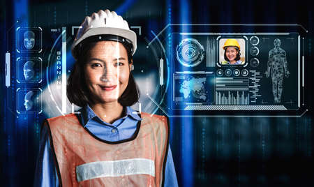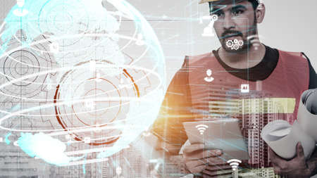 Future building construction and inventive engineering project concept with HUD hologram graphic design. Building engineer, architect people or construction worker works with modern civil technology.
