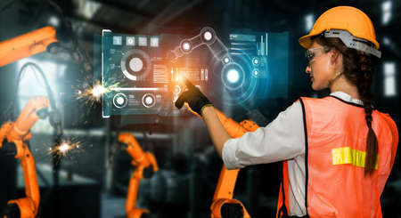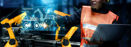 futuristic industry 4.0 technology concept, engineer stand in front of robot in manufacturing and use automaion robot with augmented mixed virtual reality, artificial intelligence, machine lernning 5g
