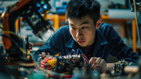 The picture of the east asian male teenager is working on the mechanical robot in his own workshop, the technician also require skill like technical knowledge, time management and experience. AIG43.