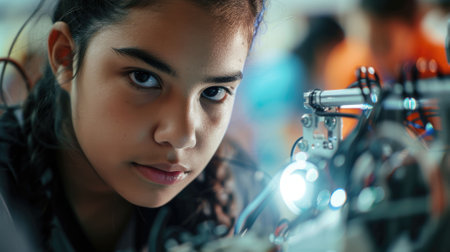 The close up picture of the hispanic girl participating in robotics or mechanic competition, robotics competition require robotics knowledge and skills, focus and concentration, adaptability . AIG43.