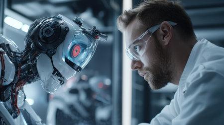 Human-robot interaction close-up in an industrial robotics lab, ideal for showcasing future of automation and AI in branding