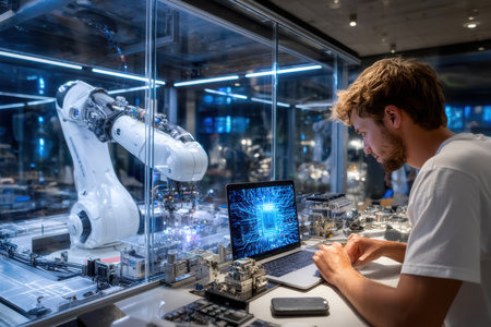 Young male engineer with glasses working on robotics project in modern lab setting