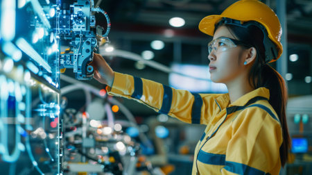 a woman in hard hat looking at circuitry in the factory.