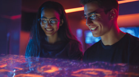 Portrait of young couple playing video games in neon light at night