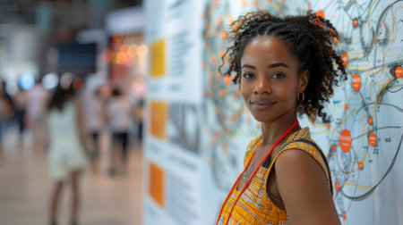 A young african american woman examines innovative tech solutions at a bustling business conference event, embodying professionalism and curiosity.