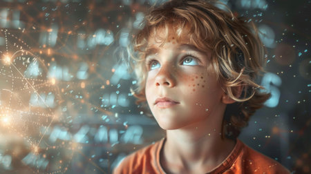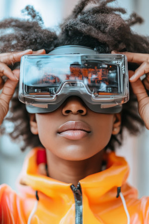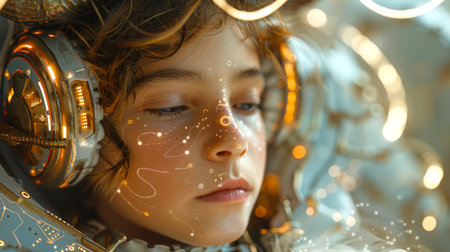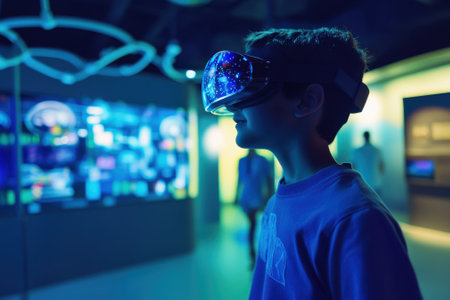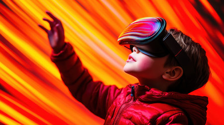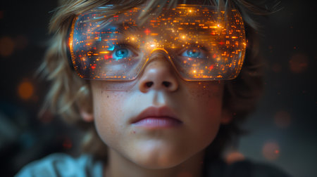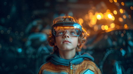 Childhood Technovision A child in VR glasses navigates augmented reality amidst neon lights, portraying the enchanting fusion of gadgets, virtual reality, and the exciting world that lies ahead.