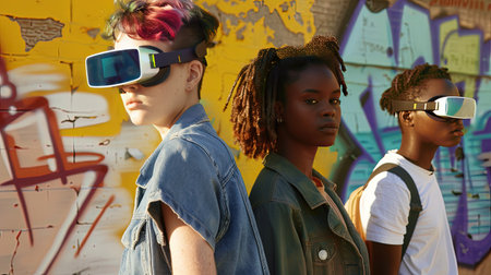 Skilled creative artist using VR glasses painting futuristic digital art at wall. Professional graphic designer making street art by using visual reality goggle with vibrant colorful color. AIG42.