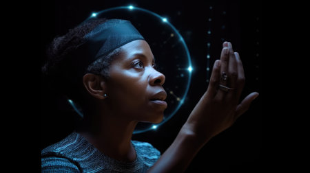 Mature black woman with wonder, curiosity, looking at holographic digital display, futuristic technology, innovation. Generative AI AIG20.