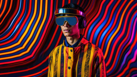 Young male model wearing VR posing with trendy fashion outfit and colorful vibrant glowing lime green optical art abstract background. Picturesque generative AI