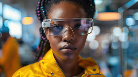 The close up picture of the african american software engineer female is wearing the smart glasses and working inside office, the software engineer require skills like programming and language. AIG43.