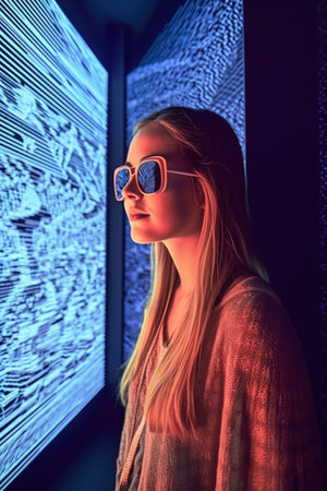 A woman standing in front of a wall covered in geometric shapes. Generative AI image.