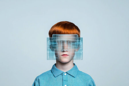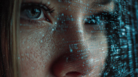 A close-up of a woman's face with digital overlays symbolizing the integration of human and technology, artificial intelligence, and biometrics.