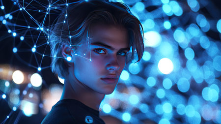 An intense portrait capturing a youthful male with striking cerulean eyes, adorned with sleek, cybernetic features that blend human emotion with advanced technology.