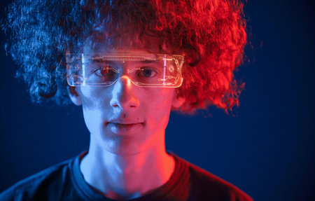 Close up view. In futuristic eyewear. Young man with curly hair is indoors illuminated by neon lighting.