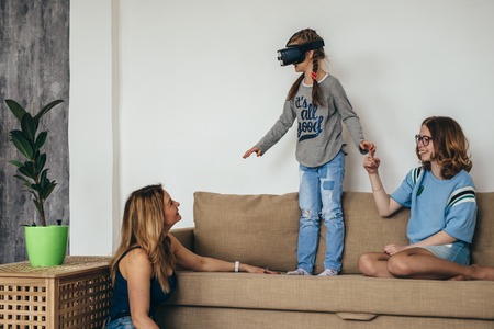 Child wearing VR glasses and wandering in the imagination. Ai generated.