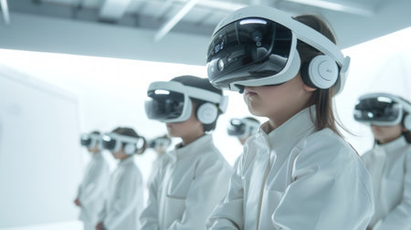 Diverse group of children wearing VR headsets in a futuristic classroom. Concept of virtual reality, education, technology.