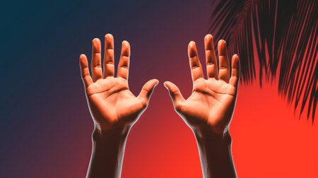 A person standing on a sandy beach with their arm extended upwards, holding their hand up against the vibrant colors of the sunset, An outstretched hand reaching towards the sky, AI Generated