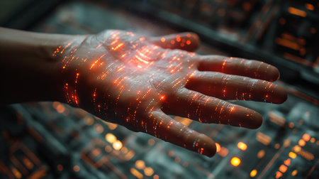 A close-up of a persons hand, showcasing a biohacked implant seamlessly integrated with their skin and connected to their nervous system