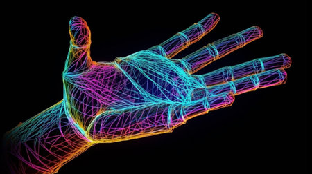 A stunning representation of a futuristic hand, featuring a neon digital network. The artwork illustrates advanced technology concepts in an innovative, high-tech environment.