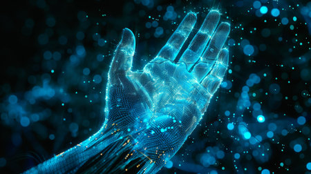 Close-up of a hand with a futuristic holographic network pattern overlay, symbolizing technology and connectivity.