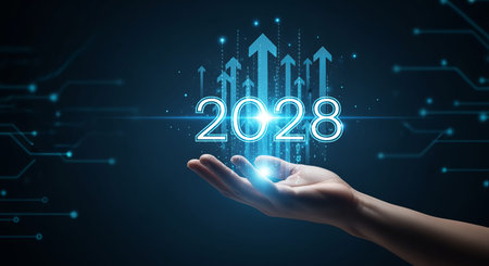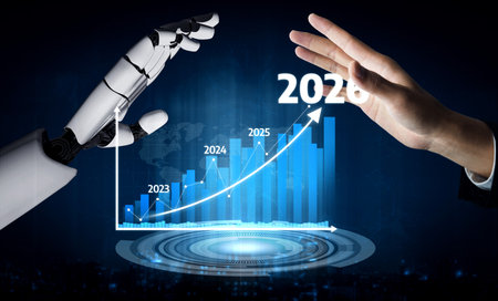 Image depicting a robot hand and a human hand reaching towards a rising graph, illustrating growth trends from 2023 to 2026 in technology and innovation. Tessel