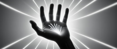 Open hand with blue neon light patterns, suggesting technology or futuristic concepts, with a dark blurred background.