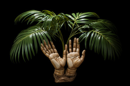 A hand is extended towards sunlight filtering through palm leaves creating a warm inviting atmosphere in a garden.