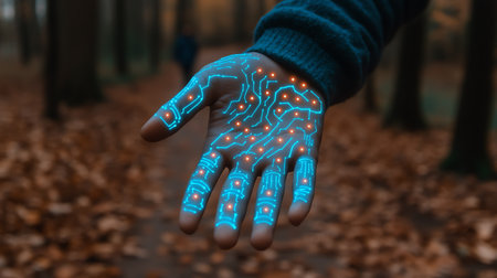 Human hand with futuristic blue circuit board pattern, suggesting innovation and technological advancement