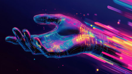 This striking image features a digital hand illuminated with neon lights, symbolizing technology and artificial intelligence in a captivating abstract design.