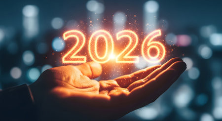 A businessman holds an illuminated loading bar transitioning from 2025 to 2026, symbolizing anticipation and hope for success in the upcoming year.