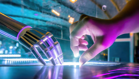 A robotic hand engages with a tablet showcasing vibrant data visuals, symbolizing advanced technology integration in a modern office setting.