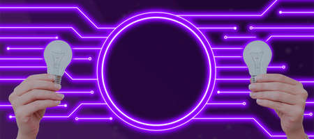 Businesswoman Holding Bulbs Around Futuristic Design And Showing New Ideas. Woman Having Lights In Hands Presenting Important Business Plans And Strategies.