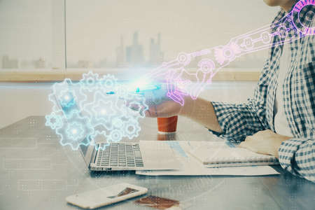 Double exposure of woman hands working on computer and data theme hologram drawing. Tech concept.