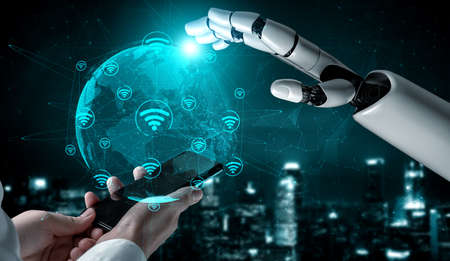 Futuristic robot artificial intelligence enlightening AI technology development and machine learning concept. Global robotic bionic science research for future of human life. 3D rendering graphic.